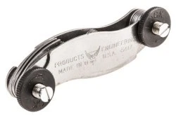 Wskaźnik skoku śruby. Odpowiedni dla gwintów metrycznych 60° Wąskie ostrza umożliwiają stosowanie wewnętrznych i zewnętrznych gwintów śrub Urządzenie blokujące każde z końców zabezpiecza ostrza przed przechowywaniem lub użyciem Prawidłowe nachylenie jest określane przez dopasowanie zębów łopat z gwintami Łopaty chronione w solidnej stalowej obudowie