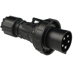 Wtyczka siłowa PCE POWER TWIST to przenośne, 5-biegunowe złącze przemysłowe o prądzie znamionowym 63 A i napięciu 400 V, zaprojektowane do bezpiecznego i trwałego podłączania urządzeń w wymagających warunkach, z wysokim stopniem ochrony IP67 oraz solidną konstrukcją z tworzywa sztucznego i niklowanymi stykami CuZn.