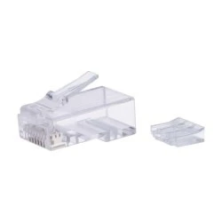 Nieekranowany konektor RJ45 8p8c. Do przewodu okrągłego z żyłą z pojedynczego drutu. Nierozbieralny.RJ-45 (8P8C ) to rodzaj ośmiostykowego złącza (gniazdo i wtyk) używanego najczęściej do zakończenia przewodów elektrycznych. Wykorzystywane w różnego rodzaju sprzęcie telekomunikacyjnym i komputerowym. Najbardziej rozpowszechnione jako podstawowe złącze do budowy przewodowych sieci komputerowych w standardzie Ethernet.