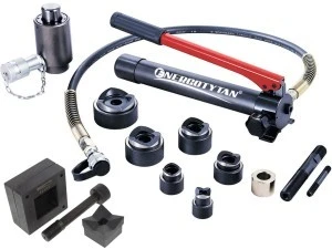 Hydrauliczny zestaw walizkowy wycinaków ENERGOTYTAN POLSKA WH-15 (standard + 45x45) służy do wycinania otworów okrągłych w stali zwykłej pod dławiki, przyciski, oświetlenie sygnalizacyjne, przyrządy pomiarowe, przepusty kablowe, itp. Trzy ostrza tnące umieszczone są symetrycznie co umożliwia idealne i bezproblemowe wycięcie otworu bez jego dalszej obróbki.
