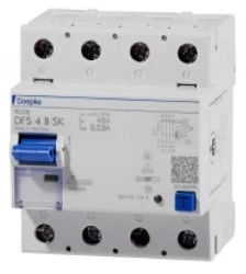 Wyłącznik różnicowoprądowy 3 fazowy w typie B reaguje na prądy stałe gładkie, przemienne sinusoidalne, prądy pulsujące oraz prądy odkształcone o częstotliwościach do 100 kHz. Charakterystyka SK zapewnia nieczułość na prądy o wysokich częstotliwościach gwarantując bezprzerwowe zasilanie bez narażenia organizmu ludzkiego w razie porażenia na wystąpienie efektu migotania komór serca. Stosowany w instalacja gdzie mogą występować prądy upływowe odkształcone wraz ze składową stałą np. falowniki. Ze względu na charakterystykę SK urządzenie jest dedykowane do instalacji przemysłowych. Reaguje na składową stałą w pełnym zakresie. Posiada człon krótkozwłoczny (KV) dzięki czemu zapewnia nieczułość na udary prądowe o czasie trwania krótszym niż 10 ms. Wytrzymałość udarowa – 3 kA Przewód neutralny po lewej stronie Sygnalizacja wyzwolenia wyłącznika (dźwignia w położeniu środkowym) Wytrzymałość zwarciowa – 10 kA