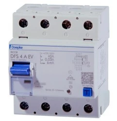 DFS4 typ A KV Wyłącznik różnicowoprądowy 3 fazowy w typie A reaguje na prądy przemienne sinusoidalne oraz prądy pulsujące o częstotliwości 50 Hz. Reaguje również na składową stałą o wartości do 6 mA. Wykonanie krótkozwłoczne (KV ) zapewnia nieczułość na udary prądowe o czasie trwania krótszym niż 10 ms. Wytrzymałość udarowa – 3 kA Przewód neutralny po lewej stronie Sygnalizacja wyzwolenia wyłącznika (dźwignia w położeniu środkowym) Wytrzymałość zwarciowa – 10 kA