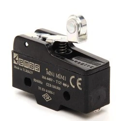 Mikrołącznik krańcowy w obudowie z tworzywa wyposażony w krótką metalową dźwignię z metalową rolką, zestyk przełączny.