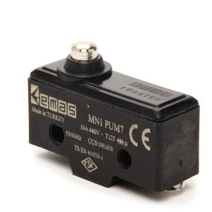 Mikrołącznik krańcowy w obudowie z tworzywa wyposażony w krótki popychacz metalowy, zestyk przełączny.