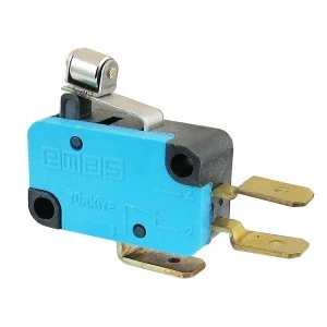 Mikrołącznik krańcowy w obudowie z tworzywa wyposażony w dźwignię krótką z rolką poprzeczną, metalową. Zestyk przełączny 1xCO.