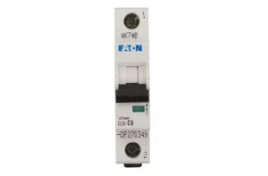 mocy 400WWyłącznik nadprądowy to jeden z podstawowych i najczęściej stosowanych urządzeń automatyki zabezpieczeniowej wykorzystywanych do ograniczania skutków zwarć i przeciążeń instalacji elektrycznej. Prąd przepływający przez obwód o zbyt dużej wartości w stosunku do wartości prądu znamionowego wyłącznika powoduje jego wyłączenie i przerwanie zasilanego obwodu. Wyłączenie zasilania ma na celu ochronę urządzeń i instalacji przed uszkodzeniem, ochronę osób przed porażeniem i ostatecznie przed wystąpieniem pożaru. Długotrwałe przeciążenie instalacji w znaczy sposób przyspiesza starzenie izolacji.Modułowy wyłącznik nadprądowy 1P C 6A CLS6 270349 wyprodukowany został przez firmę Eaton. Jest to aparat jednomodułowy, jednobiegunowy o prądzie znamionowym wynoszącym 6A i działający zgodnie z charakterystyką wyzwalania typu C. Aparaty o takiej charakterystyce najczęściej znajdują zastosowanie w obwodach w których zastosowano urządzenia elektroenergetyczne o dużych prądach rozruchowych (silniki, transformatory). Granica zadziałania wyzwalacza termobimetalowego dla tego typu wyłącznika zawiera się od 1,13 do 1,45 krotności prądu znamionowego wyłącznika. Natomiast zadziałanie wyzwalacza elektromagnetycznego odbywa się przy wystąpieniu prądu rzędu od 5 do 10 krotności prądu znamionowego wyłącznika.Wyłącznik może być doposażony w dodatkowe elementy takie jak np. styki pomocnicze, wyzwalacze wzrostowe napięciowe lub wyzwalacze podnapięciowe.Wyłącznik przeznaczony jest do mocowania na szynie montażowej TH-35. Zwarciowa zdolność wyłączeniowa tego wyłącznika określana jest na poziomie 6kA