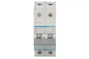 Wyłącznik nadprądowy dwubiegunowy Hager z serii MBN B 25. Łatwy montaż na szynie. Wytrzymała konstrukcja obudowy nie uszkadza się przy montażu. Szeroki zakres stosowania dzieki możliwości pracy w temp od -25 do 60 °C. Duża wytrzymałość mechaniczna 20.000 i elektryczna 4.000 cykli. Zdecydowanie jeden z lepszych produktów w swojej cenie.
