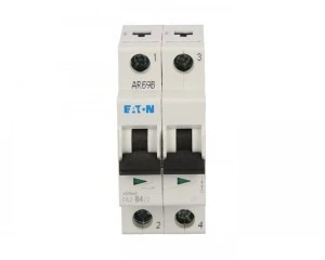 Dwubiegunowy wyłącznik nadprądowy FAZ B4/2 firmy Eaton o prądzie znamionowym 4 A i charakterystyce B, przeznaczony do ochrony obwodów w instalacjach budynkowych oraz aplikacjach przemysłowych zasilanych napięciem przemiennym.