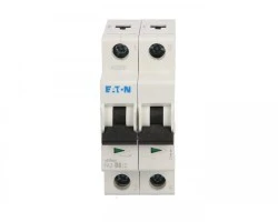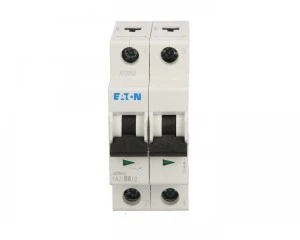 Dwubiegunowy wyłącznik nadprądowy FAZ B6/2 o charakterystyce B i prądzie znamionowym 6 A, przeznaczony do ochrony obwodów przed przeciążeniem i zwarciem w instalacjach przemysłowych oraz budynkowych. Urządzenie montuje się na szynie DIN i stosuje tam, gdzie wymagane jest szybkie wyłączenie prądów udarowych o niewielkim współczynniku tolerancji.