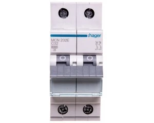 Wyłącznik nadprądowy dwubiegunowy Hager z serii MCN C 32. Łatwy montaż na szynie. Wytrzymała konstrukcja obudowy nie uszkadza się przy montażu. Szeroki zakres stosowania dzieki możliwości pracy w temp od -25 do 60 °C. Duża wytrzymałość mechaniczna 20.000 i elektryczna 4.000 cykli. Zdecydowanie jeden z lepszych produktów w swojej cenie.