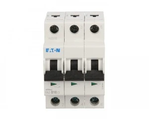 Wyłącznik nadprądowy FAZ B10/3 to trójbiegunowy aparat ochronny typu B o prądzie znamionowym 10 A, przeznaczony do zabezpieczania obwodów przemysłowych i budynków użyteczności publicznej przed przeciążeniami i zwarciami.