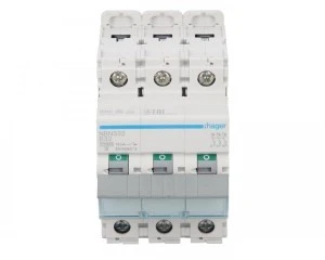 Wyłącznik nadprądowy trójbiegunowy Hager z serii NBN B32. Łatwy montaż na szynie. Wytrzymała konstrukcja obudowy nie uszkadza się przy montażu. Szeroki zakres stosowania dzieki możliwości pracy w temp od -25 do 60 °C. Duża wytrzymałość mechaniczna 20.000 i elektryczna 4.000 cykli. Zdecydowanie jeden z lepszych produktów w swojej cenie.