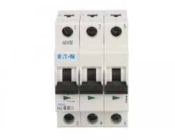 Trójbiegunowy wyłącznik nadprądowy FAZ B32/3 o prądzie znamionowym 32 A i charakterystyce B, przeznaczony do ochrony obwodów trójfazowych w instalacjach budynków i zakładów przemysłowych; stosowany jako zabezpieczenie obwodów zasilających i rozdzielnic.