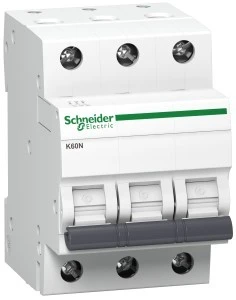 K60N-C50-3 ,o numerze A9K02350. Wyłącznik nadprądowy dopasowany do potrzeb budownictwa mieszkaniowego i podobnego. Podwójne zaciski od dołu (szyna + przewód). Karbowane zaciski zwiększające pewność podłączenia. Styk migowy - szybkość zamykania styków nie zależy od szybkości manewrowania dźwignią aparatu.