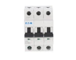Trójpolowy wyłącznik nadprądowy Eaton FAZ C63/3 o prądzie znamionowym 63 A i charakterystyce C przeznaczony do ochrony obwodów AC w rozdzielnicach przemysłowych i budynkowych. Urządzenie stosuje się do zabezpieczania obwodów z umiarkowanymi prądami rozruchowymi, np. zasilania silników, oświetlenia i obwodów ogólnych.