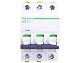Wyłącznik nadprądowy iC60N-D1-3 D 1A 3-biegunowy ,o numerze A9F05301. Możliwość bezpośredniego podłączenia dwóch przewodów o różnych przekrojach. Opt yczny wskaźnik Visi-Trip wyzwolenia elektrycznego, biało-czerwony. Możliwość demontażu pojedynczego aparatu bez potrzeby zdejmowania szyny łączeniowej. Zdjemowanie z szyny DIN bez użycia narzędzi. Jego klasa ograniczenia 3 (zgodnie z normą EN/IEC60898-1) poprawia koszt ochrony obwodu odpływowego. Unikalny wskaźnik Visitrip skraca czas interwencji, pokazując uszkodzony obwód.