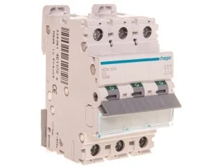 Wyłącznik nadprądowy trójbiegunowy Hager z serii NDN D 4. Łatwy montaż na szynie. Wytrzymała konstrukcja obudowy nie uszkadza się przy montażu. Szeroki zakres stosowania dzięki możliwości pracy w temp od -25 do 60 °C. Duża wytrzymałość mechaniczna 20.000 i elektryczna 4.000 cykli. Zdecydowanie jeden z lepszych produktów w swojej cenie.
