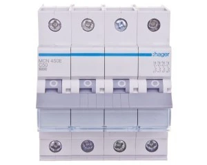 Wyłącznik nadprądowy czterobiegunowy Hager z serii MCN C50. Łatwy montaż na szynie. Wytrzymała konstrukcja obudowy nie uszkadza się przy montażu. Szeroki zakres stosowania dzieki możliwości pracy w temp od -25 do 60 °C. Duża wytrzymałość mechaniczna 20.000 i elektryczna 4.000 cykli. Zdecydowanie jeden z lepszych produktów w swojej cenie.