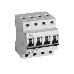 Wyłącznik z zabezpieczeniem nadmiarowo-prądowym: służy od ochrony przewodów przed przeciążeniami i zwarciami w instalacjach i urządzeniach, zgodność z normami PN-EN 60898-1; napięcie znamionowe 230V AC; prąd znamionowy 63A; częstotliwość znamionowa 50Hz; temperatura pracy: 5°C do 40°C; zakres stosowanych przewodów: 1-25 mm2; charakterystyka wyzwalania C; klasa ograniczania energii: 3; liczba modułów: 4; prąd znamionowy zwarciowy 6000A; stopień ochrony IP20; liczba biegunów: 4.