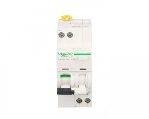 Wyłącznik kombinowany iDPNNVigi-B6-30-A B 6A 1N-biegunowy 30 mA typ A ,o numerze A9D56606. Dwuczłonowa dźwignia informuje, który z członów wyłącznika wyzwolił. Optyczny wskaźnik Visi-Trip wyzwolenia elektrycznego, biało-czerwony oraz wskaźnik Visi-Safe -zielony wskaźnik potwierdzający otwarcie styków wyłącznika. Możliwość sprawdzania poprawności działania przyciskiem kontrolnym "T" jedynie raz do roku, przez pierwsze 7 lat użytkowania.
