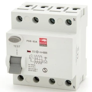 Wyłącznik różnicowoprądowy (różnicówka) KOOP Elektro FSS 4P 63A to elektryczne urządzenie zabezpieczające, które rozłącza obwód po wykryciu, że prąd elektryczny z niego wypływający nie jest równy prądowi wpływającemu.