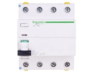 Wyłącznik różnicowoprądowy serii iID, o numerze A9Z21425, iID-25-4-30-A, 4-biegunowy, prąd znamionowy 40A, czułość 30 mA, typ A Pozwala na realizację ochrony przeciwporażeniowej w instalacjach elektrycznych. enterPodwójne zaciski - możliwość bezpośredniego podłączenia dwóch przewodów o różnych przekrojach. Optyczny wskaźnik Visi-Trip wyzwolenia elektrycznego, biało-czerwony. Możliwość demontażu pojedynczego aparatu bez potrzeby zdejmowania szyny łączeniowej. Zdjemowanie z szyny DIN bez użycia narzędzi. Możliwość sprawdzania poprawności działania przyciskiem kontrolnym "T" jedynie raz do roku, przez pierwsze 7 lat użytkowania. Tor N umieszony po lewej stronie, ułatwia oszynowanie z wyłącznikami nadprądowymi.