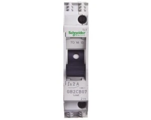 Wyłącznik TeSys GB, 1-biegunowy (1P), 2A/250V IEC/277V UL, do ochrony obwodów sterowania urządzeń przemysłowych. Zapewnia ochronę termiczno-magnetyczną z magnetycznym poziomem wyzwalania 26A (13 In) i zdolnością wyłączania Icu 15kA@240V. Może być również stosowany do ochrony obciążeń DC do 2A/48V DC-13 ze zdolnością wyłączania Icu 1,5kA@24V. Kompaktowe urządzenie (szerokość 15 mm), montaż na szynie DIN 35 mm, sterowanie za pomocą dźwigni przełączającej (start-stop gwarantowany przez 8000 cykli). Sprzedawane w partiach po 6 sztuk. Posiada certyfikat zgodności z wieloma normami (IEC, UL, CSA), produkt Green Premium (RoHS/REACh).