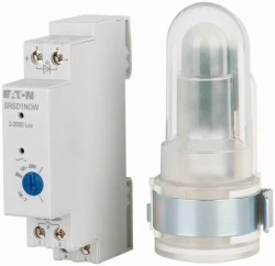Analogowy wyłącznik intensywności światła SRSD1NOW 196845 przeznaczony do automatycznego załączania i wyłączania obwodów oświetleniowych w zależności od natężenia oświetlenia otoczenia. Urządzenie montowane na szynie DIN (1 TE) z zewnętrznym czujnikiem natężenia światła i jednym stykiem NO.
