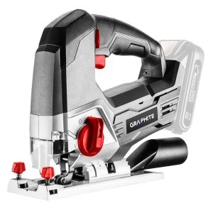 Wyrzynarka GRAPHITE, współpracująca z akumulatorami 18V Li-Ion GRAPHITE Energy+. Urządzenie przeznaczone jest do precyzyjnego i szybkiego cięcia drewna i metalu, o maksymalnej grubości odpowiednio 80 mm i 10 mm. Układ regulacji obrotów pozwala na pracę z prędkością od 0 do 2400 suwów na minutę. Wyrzynarka posiada aluminiową stopę z regulacją kąta nachylenia w zakresie od 0° do 45° w prawo i lewo. Posiada funkcję 3-stopniowej regulacji wielkości ruchu wahadłowego, pozwalającą na zwiększenie szybkości cięcia w wybranych materiałach. Elektronarzędzie wyposażono w beznarzędziowy system wymiany brzeszczotów oraz diodę LED, oświetlającą miejsce pracy. Brzeszczot wyrzynarki (skok 25 mm) został zabezpieczony przezroczystą osłoną, wykonaną z wytrzymałego poliwęglanu. Uchwyt roboczy urządzenia przystosowano do pracy z brzeszczotami typu T. Rękojeść wyposażono w wygodny włącznik z blokadą chroniącą przed przypadkowym uruchomieniem, a miejsce chwytu pokryto antypoślizgowym materiałem dla większego komfortu oraz bezpieczeństwa. Aby usprawnić usuwanie pyłu z powierzchni obrabianego materiału, wyrzynarka została wyposażona w układ zdmuchiwania i odprowadzania pyłu. W zestawie z wyrzynarką znajduje się prowadnica równoległa.