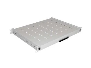 Stabilność półki zapewnia czteropunktowy montaż, który nadaje całej konstrukcji odpowiednią sztywność i niezawodność. Z kolei regulowane uchwyty montażowe ułatwiają instalację w szafach o różnych głębokościach, co czyni ją rozwiązaniem uniwersalnym i elastycznym w dopasowaniu do konkretnej konfiguracji. Praktyczne otwory w powierzchni półki umożliwiają łatwe zarządzanie kablami oraz wspierają cyrkulację powietrza i odprowadzanie ciepła z urządzeń. Dodatkowym atutem jest dedykowany uchwyt, który umożliwia proste i płynne wysuwanie szuflady z szafy rack, zwiększając funkcjonalność całego systemu.