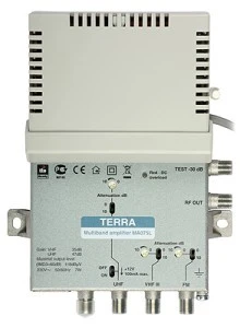 Wzmacniacz budynkowy MA-075L R82330 firmy Terra to urządzenie dedykowane do instalacji indywidualnych lub niewielkich instalacji zbiorczych na kilkadziesiąt gniazd. Podstawowym jego zadaniem jest podniesienie sygnału do takiego poziomu aby był możliwy odbiór na kilku lub kilkunastu odbiornikach. Wzmacniacz posiada wejścia: sygnału radiowego FM (88-108 MHz), pasma VHFIII (174-230 MHz) oraz pasma UHF (470-790 MHz). Wzmocnienie w pasmach FM oraz VHFIII wynosi 35 dB, natomiast w paśmie UHF wynosi 47dB.