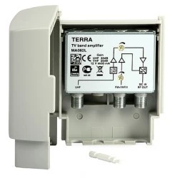 Wzmacniacz masztowy MA082L R82024 firmy Terra to urządzenie dedykowane do instalacji indywidualnych lub niewielkich instalacji zbiorczych na kilkadziesiąt gniazd. Podstawowym jego zadaniem jest podniesienie sygnału do takiego poziomu aby był możliwy odbiór na kilku lub kilkunastu odbiornikach. Wzmacniacz posiada wejścia: sygnału pasma FM+VHFIII(88-108 MHz+174-230 MHz) oraz pasma UHF (470-790 MHz). Wzmocnienie w pasmach FM+VHFIII wynosi 20 dB, natomiast w paśmie UHF wynosi 30dB.