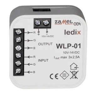 Wzmacniacz WLP-01 przeznaczony jest do współpracy ze sterownikami RGB. Znajduje on zastosowanie gdy obciążenie produktów RGB przekracza maksymalną obciążalność prądową sterownika. Wzmacniacze stosuje się także w przypadku bardzo długich instalacji RGB w celu zapewnienia synchronicznej pracy wszystkich modułów. Wzmacniacz posiada trzy wyjścia typu MOSFET o maksymalnej obciążalności ciągłej 2,5 A. Wszystkie połączenia wykonuje się przy użyciu zacisków śrubowych. Wzmacniacz umożliwia realizację układów szeregowych i równoległych. Obudowa dopuszkowa o niewielkich rozmiarach umożliwia łatwą zabudowę w puszkach instalacyjnych o średnicy ?=60 mm.