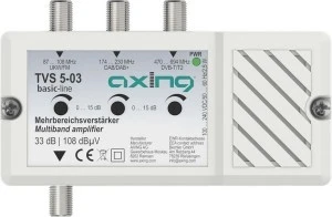 Ten wzmacniacz antenowy posiada 3 wejścia, które można podłączyć do 3 anten. Wejście 1 służy do podłączenia anteny radiowej FM / FM w zakresie 87-107 MHz. Przy wejściu 2 można obsługiwać antenę VHF do odbioru radia cyfrowego DAB+. Wejście 3 jest przeznaczone do połączenia z anteną UHF dla telewizji cyfrowej DVB-T2 HD w zakresie 470-694 MHz. Przy tym skutecznie eliminuje zakłócenia z sieci komórkowych. Wzmocnienie wynosi 33 dB. Każde wejście można oddzielnie zmniejszyć o 0 do 15 dB za pomocą regulatora poziomu. Wszystkie przyłącza są wykonane jako gniazdo F. Zasilacz jest wbudowany.