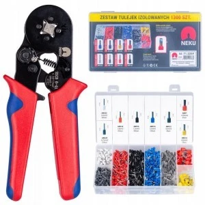 W zestawie, wraz z zaciskarką, znajduje się 1300 sztuk izolowanych tulejek kablowych o rozmiarach od 0,5 do 10 mm², zapakowanych w praktyczne pudełko, które ułatwia organizację pracy. Dzięki temu narzędzie jest gotowe do użycia zaraz po wyjęciu z opakowania.