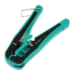 Poręczny zaciskacz złączy modularnych RJ-45, RJ-12, RJ-11, RJ-10 (Pro-Crimper Modular Tool CP373). Narzędzie posiada obcinacz przewodów oraz ściągacz izolacji z kabli UTP/STP (skrętka).
