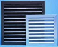 Stałe nawiewy noży. Zewnętrzne louver RS Pro są dostosowane do wlotu powietrza i wylotu powietrza na wzniesieniach budynku. Są one często wykorzystywane jako cecha architektury nowoczesnych konstrukcji budowlanych, a ich uniwersalność sięga konfiguracji konstrukcji okrągłych i trapezoidalnych. Do użytku zewnętrznego Żaluzje z wewnętrzną wargą przeciwdeszczową ustawioną na wysokość 38 mm i pod kątem 45° Kołnierze niewiercone o szerokości 32 mm z całkowicie przyspawanymi i profilowanymi narożnikami Obszar wolny, około 50% Walcownica aluminiowa lub emaliowana, brązowa warstwa