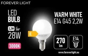 Żarówki LED Forever Light E14 G45 to praktyczne źródła światła w kształcie kulki, które sprawdzają się zarówno w oświetleniu głównym, jak i dekoracyjnym. W ofercie dostępne są modele o różnych mocach i jasności: 2.2W – 270 lm, 4.8W – 630 lm oraz 8.5W – 1000 lm. Dzięki temu każdy klient może wybrać żarówkę dopasowaną do swoich potrzeb i charakteru wnętrza.