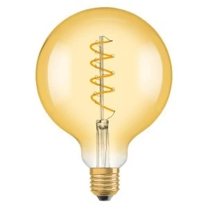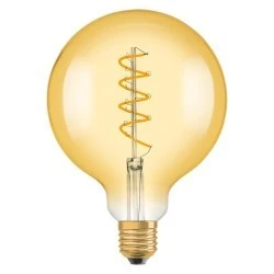 Żarówka dekoracyjna LED w klasycznym kształcie G125 to najnowszy produkt renomowanej i uznanej w branży oświetleniowej firmy OSRAM. Żarówka LED w stylu VINTAGE 1906 z trzonkiem E27 to wysokiej jakości źródło światła LED zamknięte w złocistym szkle o klasycznym kształcie. Prezentowana filamentowa żarówka świetnie sprawdzi się jako oświetlenie dekoracyjne w naszych domach lub mieszkaniach. Jej klasyczny wygląd sprawi, że twoje gniazdko nabierze przytulnego charakteru, a wzrok odpocznie przy przyjemnym dla oka świetle. Żarówka została wyprodukowana przy wykorzystaniu najnowszych technologii energooszczędnych diod LED, które charakteryzują się wysoką wydajnością parametrów świetlnych oraz wyjątkowo długą trwałością.