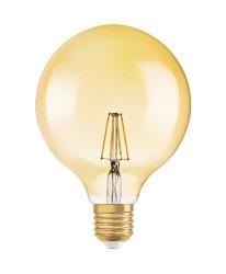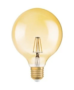 Żarówka LED Filament GLOBE GOLD z serii VINTAGE 1906 renomowanej i uznanej w branży oświetleniowej firmy OSRAM z trzonkiem E27 o mocy 7.5W = 51W (tradycyjnej żarówki) to ozdobne źródło światła cechujące się klasycznym kulistym kształtem G125. Żarówka GLOBE GOLD Filament posiada funkcję ściemniania. Jest to ciekawe połacznie dekoracyjnego stylu vintage z nowoczesnym wnętrzem. Dzięki swojemu nie przeciętnemu wyglądowi żarówka ta idealnie wkomponuje sie w nasze wnętrza dodając im ciekawszego wyglądu i charakteru. Vintage 1906 może być montowane we wszystkie tradycyjne oprawy z gniazdem E27 co sprawia że wymiana starej żarówki na ten model jest banalnie prosta.