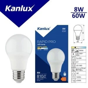 Lampa z diodami LED, zasilanie 220-240V~;50Hz, moc 8W, ekwiwalent 8W-60W, źródło światła LED SMD, trzonek E27, Tc 3000K, strumień świetlny 810lm, kąt rozsyłu światłości 180°, trwałość 15000h, ilość cykli włącz/wyłącz >25000.