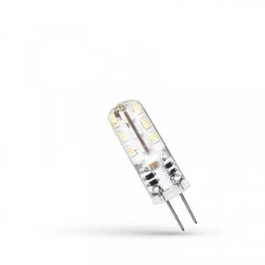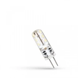 Źródło LED G4 1,5 W w silikonowej osłonie. Doskonale sprawdzi się w gospodarstwie domowym, hotelu, sklepie czy restauracji jako oświetlenie dekoracyjne lub akcentujące i może być montowana w oprawach, które wyposażone są w trzonek G4. Świeci światłem o zimnej barwie (6000K), która sprawdzi się w pomieszczeniach, w których musimy być najbardziej skupieni i skoncentrowani, np. na technicznych stanowiskach pracy. Szeroki kąt świecenia 270° zapewnia równomierne oświetlenie pomieszczeń.