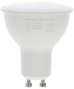 Żarówka LED (diodowa) generuje światło poprzez przepływ prądu przez diodę półprzewodnikową. Model ten ma podstawę typu GU10, co oznacza, że posiada dwa sztyfty do montażu. Zaprojektowana jest do pracy z napięciem sieciowym 230V i ma moc 8W. Generuje strumień świetlny 760 lumenów. Temperatura barwowa tej żarówki wynosi 6500K, co oznacza, że emituje zimne, prawie białe światło. Kąt świecenia wynosi 120 stopni.