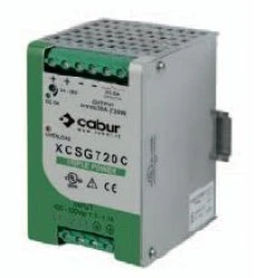 Zasilacz impulsowy XCSG720C przeznaczony do zasilania obwodów przemysłowych o znamionowym napięciu 24 VDC i natężeniu do 30 A; typ urządzenia: trójfazowy zasilacz AC/DC o mocy wyjściowej 750 W, przewidziany do montażu na szynie DIN w orientacji pionowej.