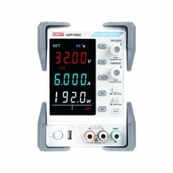 PARAMETRY GŁÓWNE Kanał 1/kanał 2 Napięcie wyjściowe: 0 ~ 32 V Natężenie prądu wyjściowego: 0 ~ 6 A Moc wyjściowa: 192 W Stabilizacja: • Napięcie wyjściowe: <0,01% + 5 mV • Natężenie prądu wyjściowego: <0,1% + 10 mA Liniowość regulacji: • Napięcie wyjściowe: <0,01% + 3 mV • Natężenie prądu wyjściowego: <0,1% + 3 mA Rozdzielczość: • Napięcie wyjściowe: 10 mV • Natężenie prądu wyjściowego: 1 mA Dokładność pomiaru (25°C ±5°C): • Napięcie wyjściowe: <0,5% odczytu + 20 mV • Natężenie prądu wyjściowego: <0,5% odczytu + 10 mA Tętnienia (20 Hz ~ 20 MHz): • Napięcie wyjściowe: =<2 mV rms • Natężenie prądu wyjściowego: =<3 mA rms Opóźnienie narastania napięcia: =<100 ms (10% nastawionej wartości) Współczynnik temperaturowy napięcia wyjściowego: <=300 ppm/°C Współczynnik temperaturowy natężenia prądu wyjściowego: <=300 ppm/°C CECHY OGÓLNE Porty: USB Host (5 V/2 A), USB, RS-232 3 wyświetlacze 4-cyfrowe w wysokiej rozdzielczości, wyświetlające napięcie i prąd Zasilanie: AC 100 V/120 V/220 V/230 V ±10%, 50 Hz/60 Hz Wymiary: 136 x 194 x 327 mm Waga: 7,5 kg Akcesoria: Przewód sieciowy, przewód USB