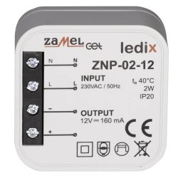 Zasilacz ZNP-02-12 to profesjonalny zasilacz impulsowy o napięciu wyjściowym 12 V DC i mocy znamionowej 2 W. Zasilacz przeznaczony jest do wsp.łpracy z typowymi produktami LED zasilanymi napięciem o wartości 12 V DC oraz sterownikami i odbiornikami radiowymi serii LEDIX. Przeznaczony jest do bezpośredniego montażu w puszce instalacyjnej.