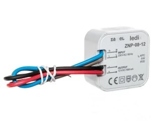 Zasilacz ZNP-08-12 to profesjonalny zasilacz impulsowy o napięciu wyjściowym 12 V DC i mocy znamionowej 8 W. Zasilacz przeznaczony jest do współpracy z produktami LEDIX takimi jak sterowniki i odbiorniki radiowe oraz innymi produktami LED zasilanymi napięciem o wartości 12 V DC. Przeznaczony jest do bezpośredniego montażu w puszce instalacyjnej. Produkt posiada zabezpieczenia przeciwzwarciowe oraz przeciążeniowe, które zwiększają bezpieczeństwo jego użytkowania. Wysoka sprawność oraz bardzo mały pobór mocy w trybie czuwania sprawiają, iż jest to rozwiązanie bardzo ekonomiczne, przeznaczone do pracy ciągłej. Zasilacz spełnia wymagania norm zharmonizowanych.