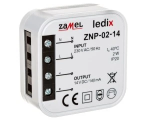 Zasilacz ZNP-02-14 to profesjonalny zasilacz impulsowy o napięciu wyjściowym 14 V DC i mocy znamionowej 2 W. Zasilacz przeznaczony jest do współpracy z produktami LEDIX (oprawy, sterowniki, odbiorniki radiowe) zasilanymi napięciem o wartości 14 V DC. Przeznaczony jest do bezpośredniego montażu w puszce instalacyjnej.