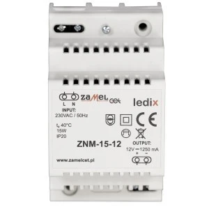 Zasilacz ZNM-15-12 to profesjonalny zasilacz impulsowy przeznaczony do montażu w rozdzielnicach na szynie TH35. Moc wyjściowa zasilacza to 15 W, a nominalna wartość napięcia wyjściowego to 12 V DC. Zasilacz przeznaczony do współpracy z osprzętem LEDIX takim jak sterowniki, odbiorniki radiowe oraz innymi produktami LED zasilanymi napięciem o wartości 12 V DC. Produkt posiada zabezpieczenia przeciwzwarciowe oraz przeciążeniowe, które zwiększają bezpieczeństwo jego użytkowania.