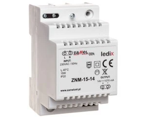 Zasilacz ZNM-15-14 to profesjonalny zasilacz impulsowy o stabilizacji napięciowej 14 V DC. Zasilacz dedykowany jest do współpracy z produktami serii LEDIX. Urządzenie wykonane w obudowie 3-modułowej, przeznaczone do montażu na szynie TH-35. Zasilacz cechuje bardzo niski pobór mocy w trybie czuwania, wysoka sprawność na poziomie 79%, duża stabilność napięcia wyjściowego oraz długoterminowa niezawodność.